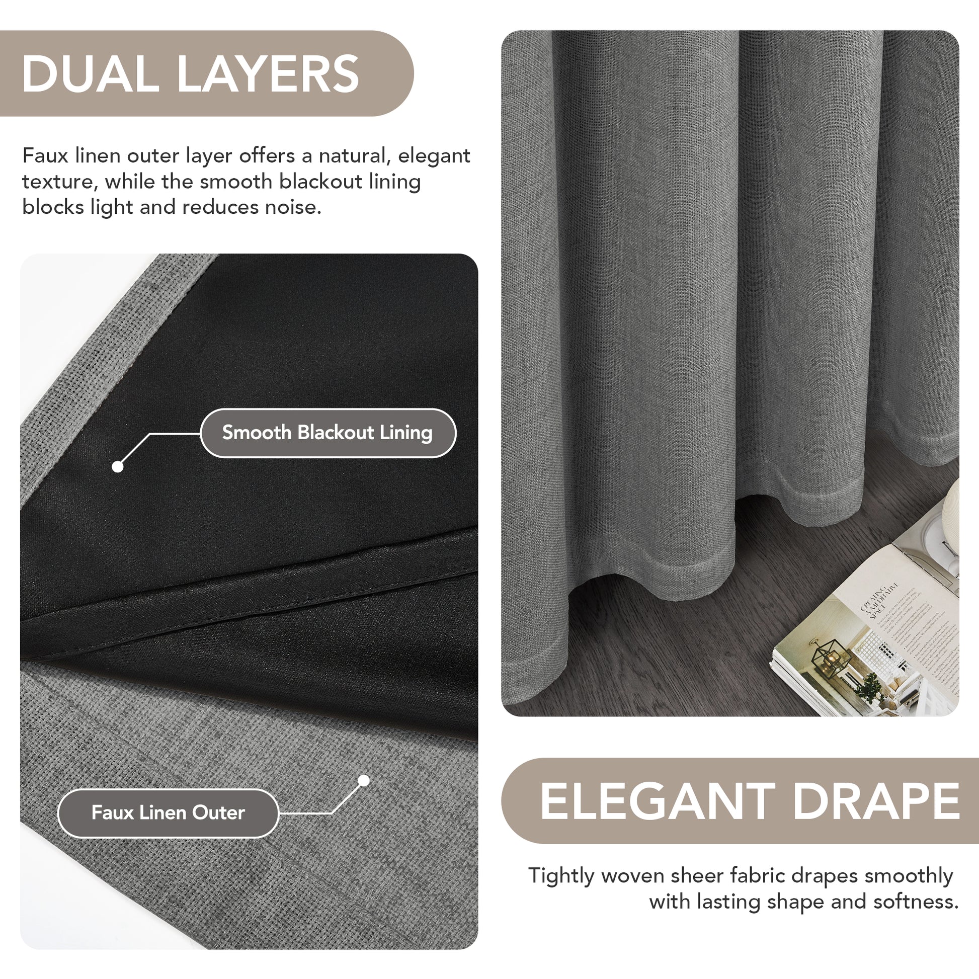 You’ll notice the linen-inspired fabric drapes naturally, adding depth without heaviness. The layered design helps soften outside light and visual distractions, making your bedroom or living room feel more restful and balanced. Designed for modern living, these curtains are easy to install, simple to care for, and thoughtfully made with materials tested for everyday comfort.